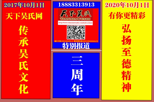 【友情提示】天下吴氏网坚持正确的舆论导向,坚持客观真实报道,坚持不站队,保持正确的主观立场,以弘扬至德精神!传播吴文化为主旋律!只要你姓吴,只要你是正能量的来稿,我们都欢迎! 《相约天下吴氏网》主题歌 作词∶吴蜀丰 作曲演唱∶吴仕长 吴氏文化正能量,至德精神在弘扬。开拓进取创辉煌,谱写时代新篇章。 三让高风孔圣赞,第一世家史记传。天上有口遍天下,家风传承树典范。 我是吴氏好儿郎,仁爱谦让传万代。相约天下吴氏网,因为有你更精彩! 来稿要求图文分开打包,〔因人力有限不接受微信图文供稿〕 投稿公共邮箱:txws4006935168@163.com 联系人吴蜀丰 电话: 18883313913 |