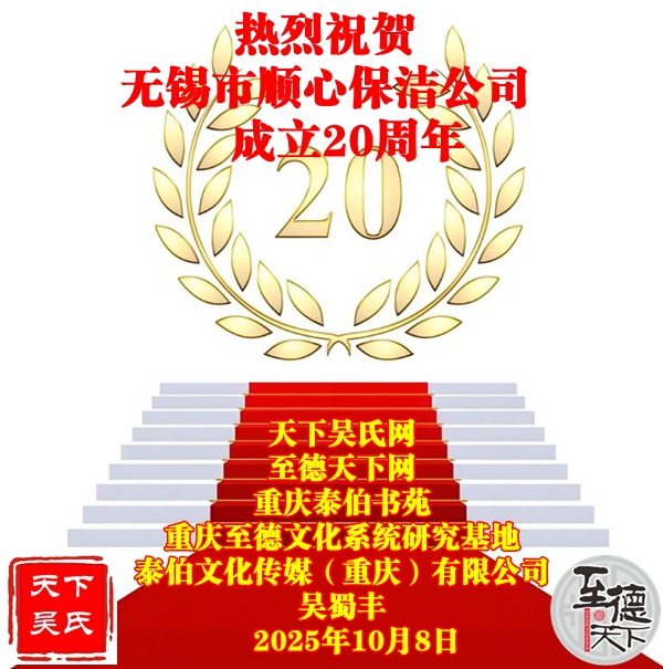 望未来继续秉持初心,携手天下吴氏网、至德天下网共扬吴文化之德商精神,再创辉煌!‌匠心二十载,洁净千万家!‌二十年风雨同行,二十载初心如磐!顺心保洁以专业铸就行业标杆,用汗水守护城市光彩!‌‌从第一块抹布到现代化服务,二十年步履不停!恭祝顺心保洁再启新程,缔造更多洁净传奇!‌‌二十载深耕细作,百分百服务承诺!致敬顺心保洁用责任与真诚赢得客户信赖!‌‌廿载春秋写华章,砥砺奋进再出发!祝顺心保洁事业长青,续写行业新辉煌!