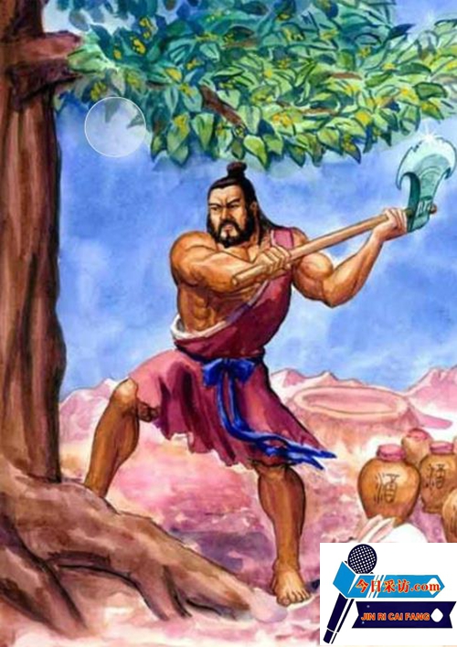《山海经》中记载一个叫吴权的人,有人将他与吴刚联系在一块。请看原文:“炎帝之孙伯陵,伯陵同吴权之妻阿女缘妇,缘妇孕三年,是生鼓、延、殳。殳始为侯,鼓、延是始为钟,为乐风。”故事讲,伯陵与吴权妻子的女儿缘妇(有人解释为与吴权妻子阿女缘妇)一起生活,并且生了三个孩子,他们是钟乐的发明者。显然吴权与吴刚是毫不相干的 吴刚伐桂的用意是什么呢?陆游的诗句“除却君山湘水平,斫却桂树月更明。”可能道出了个中原委,古人认为月亮中的阴影是桂树。唐人就演绎出唐明皇奔月和吴刚宫前伐桂可以让明月更亮的神话了。毛泽东有诗句:吴刚捧出桂花酒。敢情吴刚也知道古汾州的酿酒工艺?