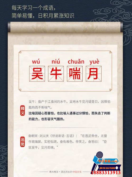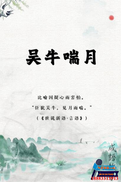 吴牛喘月—杯弓蛇影风云古谈:江淮地区有多热 看“吴牛喘月”就知道了!“杯弓蛇影”的意思是将映在酒杯里的弓影误认为蛇,比喻因疑神疑鬼而引起恐惧。“吴牛喘月”与“杯弓蛇影”都有因为疑心像某个可怕的事物而恐惧的意思,但有区别:“吴牛喘月”还有形容天气炎热的意思,但是“杯弓蛇影”并无此意。满奋为什么这样说呢,原来,中国水牛多生长在长江、淮河一带, 古代这个地方叫做吴,所以这里的牛就叫做吴牛。水牛很怕热,它只要一看到太阳, 就会全身发热,喘个不停。所以一到夏天,水牛就喜欢泡在凉水里,在阴凉的地方歇息。有的水牛看见月亮,误以为是太阳出来了,也会吓得不断喘起气来。总之,吴牛喘月是一种很奇妙的现象,满奋在这里把自己心中的惧怕借一种自然现象说得惟妙惟肖,起到了很好的解嘲作用。