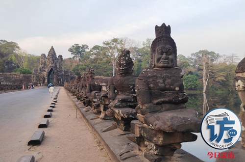 吴哥城是一处被长达12公里的城池所包围的城市。吴哥城南门(SouthGate)外的护城河上架有石桥,桥的两侧栏杆上各有一排54个石雕的半身像,一边代表神灵,另一边代表恶魔,他们手上拉着眼镜蛇化身的巨蛇王。据说宽约百米的护城河,在古时养有很多鳄鱼,是用来抵御敌人进攻的。钻进小小的南门门洞,拔地倚天的古树整齐地列在路两旁,树缝里透着温柔的晨光,轻风吹过,干叶嗒嗒地落到了车的前窗,又滑到了地上,说不出的惬意。在吴哥城中央,依照佛教须弥圣山的概念建立起了壮观的拜云寺(Bayon),环绕中央尖塔的是49座四面都雕有巨大佛脸的佛面塔,这些谜样的佛脸微笑,表情各异,安详中带有几分神秘。四面佛的四个面分别代表慈、悲、喜、舍,悲喜皆不形于色。拜云寺的回廊壁画也十分丰富,从王宫征战到市民生活应有尽有,但是给游客留下最深印象的还是四面佛那神秘的"高棉微笑"。