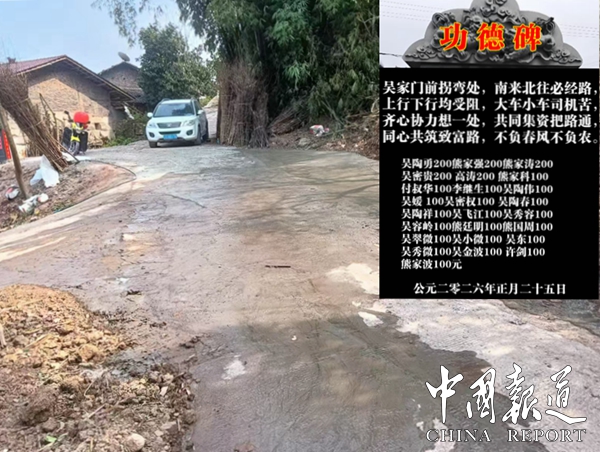 有道是,吴家门前拐弯处,南来北往必经路,上行下行均受阻,大车小车司机苦,齐心协力想-处,共同集资把路通,同心共筑致富路, 不负春风不负农。(图文/吴蜀丰 吴双)
