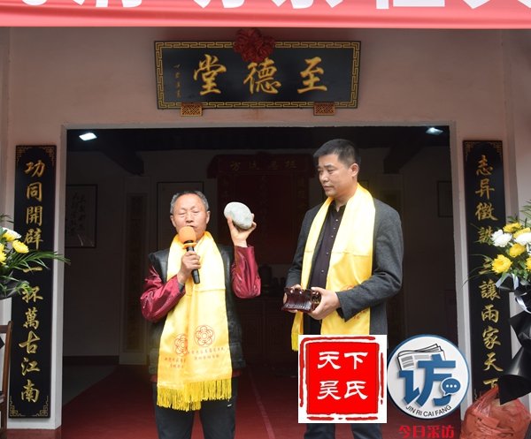 粤川两地虽相隔千里,却是根脉相连,兄弟情深,情意绵长,永世相传。我谨代表广东省龙川县吴氏协会,把吴善玉宗亲年逾91岁高龄的老父亲吴学源珍藏的《广东省龙川县吴氏簇谱》第四卷和我本人收藏的《广东省龙川县吴氏簇谱》第一卷转交给吴光勇会长。同时我们也带来了祖籍地法滔公宗祠边采集的泥土,将把这孕育生命与充满生机的故土洒在文越公祖坟上,让这带着家乡情怀的泥土在这泽润后世,福运绵延。
