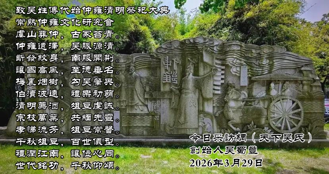 ‌      虞山葬仲,古冢苔青。仲雍遗泽,吴脉源清。断发纹身,南服开荆。让国高风,至德垂名。梅里烟树,勾吴肇兴。伯渎波远,礼乐初萌。清明荐酒,俎豆虔诚。宗枝万叶,共缅先灵。孝悌流芳,俎豆常馨。千秋俎豆,百世仪型。礼润江南,让位心同。世代铭功,‌千秋仰颂。‌