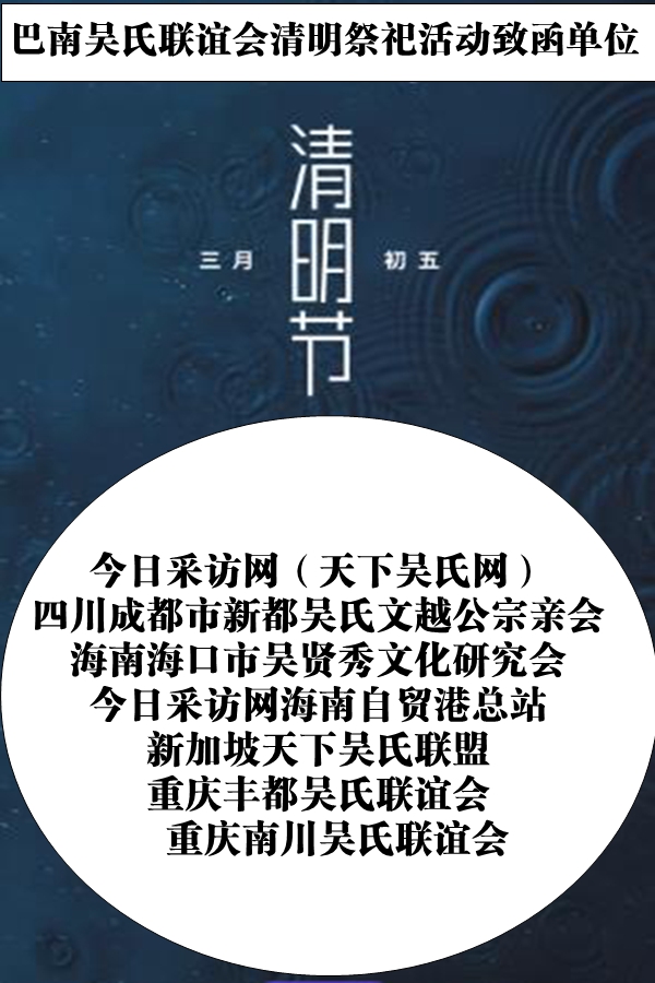 春风送暖,时序清明,慎终追远,缅怀祖德。欣闻贵会定于2026年4月4日隆重举行清明祭扫先祖活动,谨此,我们向重庆市巴南区吴氏文化促进会,向全体参与祭扫的吴氏宗亲,致以最热烈的祝贺和最诚挚的问候!