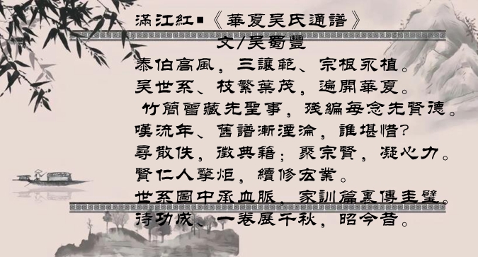 泰伯高风,三让范、宗根永植。吴世系、枝繁叶茂,遍开华夏。 竹简曾藏先圣事,残编每念先贤德。叹流年、旧谱渐湮沦,谁堪惜?寻散佚,征典籍;聚宗贤,凝心力。贤仁人擎炬,续修宏业。世系图中承血脉,家训篇里传圭璧。待功成、一卷展千秋,昭今昔。