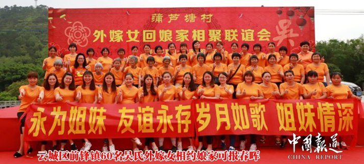 2018年4月30日,云浮市云城区前锋镇横山村委蒲芦塘村彩旗招展、锣鼓喧天,人人脸上洋溢喜庆的笑容,气氛胜过春节。该村60多名外嫁女儿自筹资金从四面八方相约回娘家相聚,有的远从外省赶回、有些从香港专门回来、就连年近八旬的也不辞辛劳坚持回乡看看。她们与村里的父老乡亲们共同开展各项活动,晚上与亲人们共进晚餐,并由外嫁女乡亲们各自排练的节目组成了丰富多彩的联谊晚会,展现了外嫁女们热爱家乡、孝敬长辈的良好风尚。