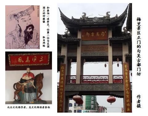 梅里,名副其实是江南文明的发祥地!当时江南尚待开发,人烟稀少。听说泰伯兄弟带来了周国先进的文化与技术,1000多户土著便尊泰伯为王,建立起了勾吴部落,泰伯兄弟断发纹身,融入了当地民众之中。随着部落日益壮大,泰伯便适时将其升格为勾吴(亦写作句吴)国。为扩大农业生产,泰伯利用崇高威望,克服巨大的困难组织兴修水利,在都城梅里开挖了江南最古老的运河:伯渎,它长87里,宽12丈,现在看起来规模仍令人惊叹。泰伯逝世后,传位仲雍。传到第四代、第五任国王周章时,经过周文王姬昌和周武王姬发的两代人努力,推翻商朝建立了大周朝。姬发追封泰伯为“吴伯”,封周章为诸侯国吴国国王。这便是吴国的来历。公元前585年,进入了春秋时期,周王朝失去了对诸侯国的控制,礼崩乐坏。仲雍的19代孙寿梦审时度势,宣布吴国独立,迁都于苏州,疆域为今江苏全部、上海大部和安徽、浙江的一部分。春秋后期吴国开始强盛,吴王阖闾任用伍子胥为相、孙武为将,在公元前506年一度攻破楚国,其子夫差继位后又战胜越国,迫使勾践屈服。并战服齐军,北上与晋国争霸,列春秋五霸之一。后因夫差骄傲自大,贪恋西施美色,不听伍子胥的劝谏而贻误战机,吴国反被越国打败,于公元前473年亡国,夫差悔恨自杀。吴国存世685年,历23任国王。吴灭国后王族子孙避难四散,为不忘故国,约定以原国名为姓,并尊泰伯为吴姓开姓始祖。这便是汉族吴姓的由来。因此,“吴文化”这三字,既有以梅里为发祥地的吴国地域文化的意思,也有吴姓文化含义在内,两者是一个有机的整体,密不可分。