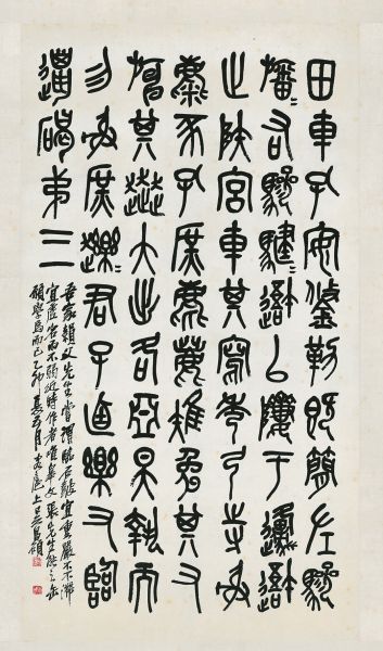 《石鼓文》是中国现存最早的一组刻石文字。大篆字体,刻于鼓形石头上的篆书文字。每鼓上有四言诗一首,记再秦君游猎的事迹,所以又名“猎碣”。原石现藏故宫博物院。《石鼓文》作为从金文向小篆发展的过渡字体,是研究先秦文字演变脉络的重要资料,同时也是学习篆书最佳的范本。清代碑学兴盛,《石鼓文》被视为篆书的正宗,吴昌硕一生酷爱篆刻,篆书是篆刻的基础,篆刻与书法相互影响,在他的篆书创作中,石鼓文创作正是吴氏书法的精华所在。吴昌硕早年的篆书主要学习杨沂孙,同时受到吴大澂的影响。与吴大澂的交往,有机会接触到大量古代文物,开阔了眼界,为日后书法篆刻的发展,起到了极大的帮助。吴昌硕大约从41岁(光绪甲申,1884年)开始实践《石鼓文》书法,43岁时接触到了好友潘钟瑞所赠的《石鼓文》拓本,还曾临摹过阮元翻刻的《石鼓文》拓本,《石鼓文》成为他篆书主要临习的范本,“从兹刻画年复年,心摹手追力愈努”,数十年锲而不舍,将钟鼎、碑碣等的文字体势,结合行书的笔法和自身的用墨习惯,形成刚柔并济、金石气浓烈且书写流畅的书写风格,具有强烈的韵律美感和苍劲朴茂的意趣,最终在《石鼓文》书法上取得了非常高的艺术成就,成为当时研精《石鼓文》的重要代表。