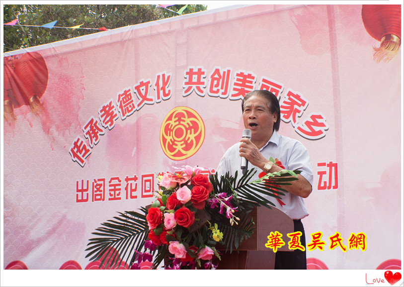 世界至德总会主席吴希民博士到场祝贺并致辞,他向阁金花和老人们表达了对诚挚的祝福。他说:“热爱家乡和爱老敬老是中华民族的传统美德,乌牛垌、乌桠斗两村风清气正,热爱家乡、爱老敬老蔚然成风。真心祝愿两村村发展越来越好,祝福每一位老人节日快乐,晚年幸福!”
