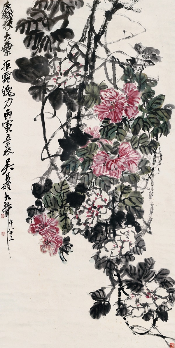 吴昌硕约34岁学画。初参学任伯年、蒲华、赵之谦等,继而上朔李复堂、金冬心、八大、青藤、白阳等。约65岁左右成熟,大器晚成。较早的作品,相对清逸俊秀,成熟期作品,以石鼓大篆的圆厚笔力,浓淡相间的没骨挥洒,铸成其雄劲苍古又恣肆烂漫的画风,一扫花卉画坛的纤柔之风。其自述诗曰:“离奇作画偏爱我,谓是篆籀非丹青”、“墨荷点破秋冥冥,苦铁画气不画形”、“梦痕诗人养浩气,道我笔气齐幽燕”。所谓“气”,正是一种蕴于画幅和笔意中的力量与气度。吴氏花卉的另一大特色,是着色古艳,喜用西洋红,强烈浓郁,而不失之俗。齐白石“衰年变法”,多以吴氏画为参照,曾作题跋云:“余见缶庐60岁前后画花卉追海上任氏,后参赵氏法,而用心过之,放开笔机,气势弥盛,横涂竖抹,鬼神亦莫之测。”