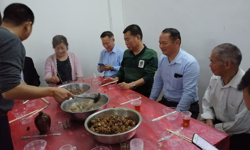 这一次,平山围的宗亲为迎接从远近各处而来的吴氏宗亲,专门宰杀了一头牛,来宴请大家,受邀请而来的吴氏宗亲,不仅有本村的念四公的后裔,也有外迁的念四公的后裔,而且还有念一公的后裔,当然还包括深吴会的来自两陆、番禺、增城、黑龙江、安徽等地的宗长、宗嫂、宗亲。正如深吴会会长吴长阳宗长所说的,一宗无二姓,吴氏一家亲,吴氏宗亲不分哪支哪派,三千年前都是一家,只是后来分散开来居住而己,无论住在哪里,无论来自哪个支系,都是一家人。