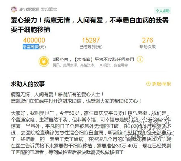 中国报道讯(吴蜀丰报道)【编者按】爱心接力!病魔无情,人间有爱,因不幸患白血病的吴世轩需要干细胞移植,病魔无情,人间有爱!感谢所有的爱心人士在忙碌中打开这封求助信,也感谢大家的帮助和关心!重庆吴氏文化发展促进会特别倡议,期待你爱心接力,伸出援助暖心之手为吴世轩尽一份爱心,截至目前2020年6月19日13点止,已有近300人在水滴筹平台为他捐款已经筹到15297元。