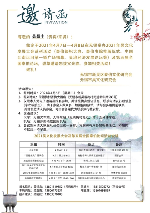 三千年二百年以前吴氏开姓始祖泰伯传代始祖仲雍三让天下,定都梅里,拉开了吴地开发建设的历史大幕,其“包容谦让、开拓创新”的至德精神,也成为吴文化的底色。为颂扬泰伯德让天下、功辟江南的丰功伟绩,弘扬吴地文化,传承泰伯精神,我们将举办2021吴文化发展大会系列活动,以时代精神赋予吴文化新内涵,以文化繁荣促进经济社会高质量发展,活动方案如下: