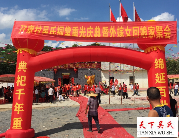 锣鼓喧天鞭炮齐鸣,雄狮起舞参拜祠堂,热闹的场面,外嫁女们登台表演节目丰富多彩,本村吴氏重阳敬老等活动同时进行!
