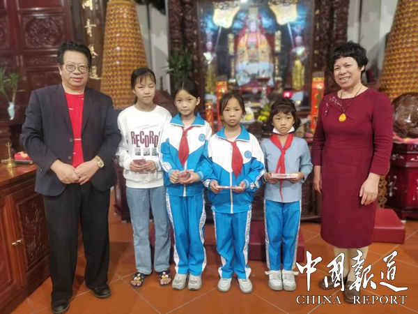 中国报道讯(吴蜀丰 报道)11月10日,无锡市顺心保洁有限公司董事长、泰伯吴氏祖地宗亲总会仲雍文化研究会会长吴焕其同夫人来到潮汕惠来玉皇宫殿给玉皇宫殿道长吴美珍收养的孤儿送去5万元人民币,让孩子们好好上学读书。