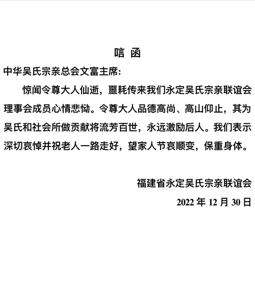 惊悉尊翁百岁仙逝,厚德追泰伯,树风留范杳然去!浙闽宗脉相连,吴越大地宗亲宗贤,此刻,庄严肃默,哀乐低迴,白菊飘悲,沉痛悼念吴府阳芽老宗长!愿他老宗长驾鹤西去,登云追星归极乐……因路途遥远,疫情隔阻.肃此电达,望见谅!
