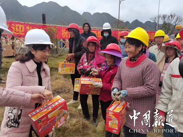 中国报道讯 (通讯员岑福山 覃 源 麦国新)为进一步体现党和政府对一线农民工的关怀,元月15日,天气寒冷,广西东兰县总工会党组书记、常务副主席班晓玲、副主席韦宇梅,县旅发中心主任韦福彪等一行来到广西第一湾国际旅游股份有限公司东兰县坡豪旅游码头木屋别墅度假休闲酒店建设工地,对上百人一线农民工开展集中慰问。